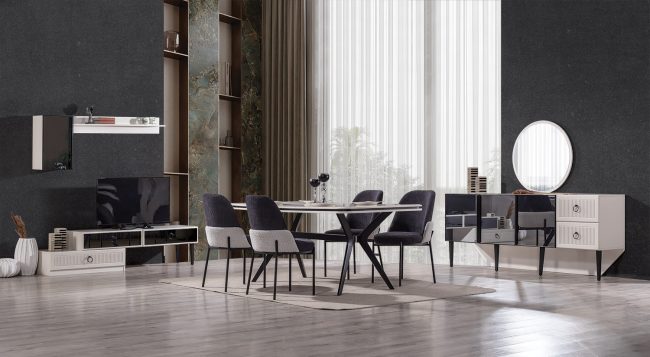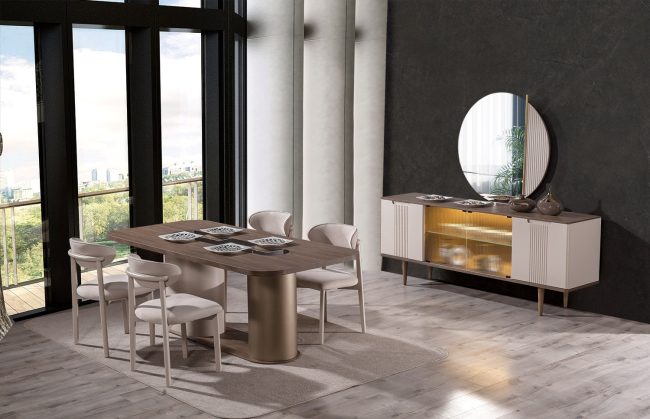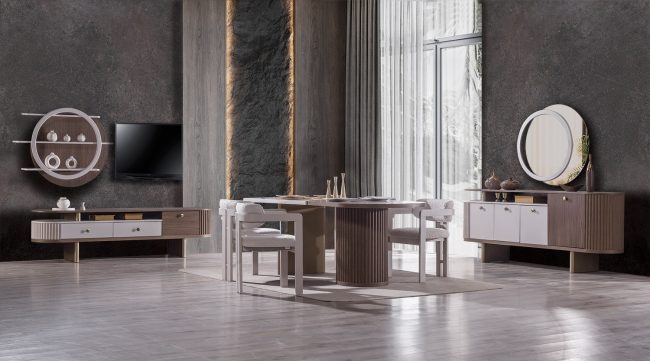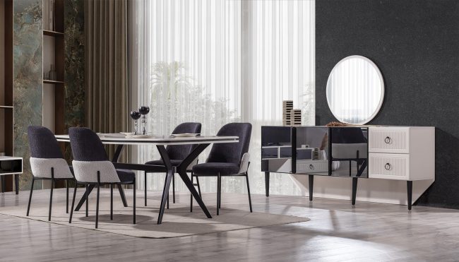Ürün Ölçüleri Sandalye: 242025 – 252029 Konsol: genişlik 220 cm / yükseklik 81 cm / derinlik 46 cm Sandalye: genişlik 54 cm / yükseklik 90…